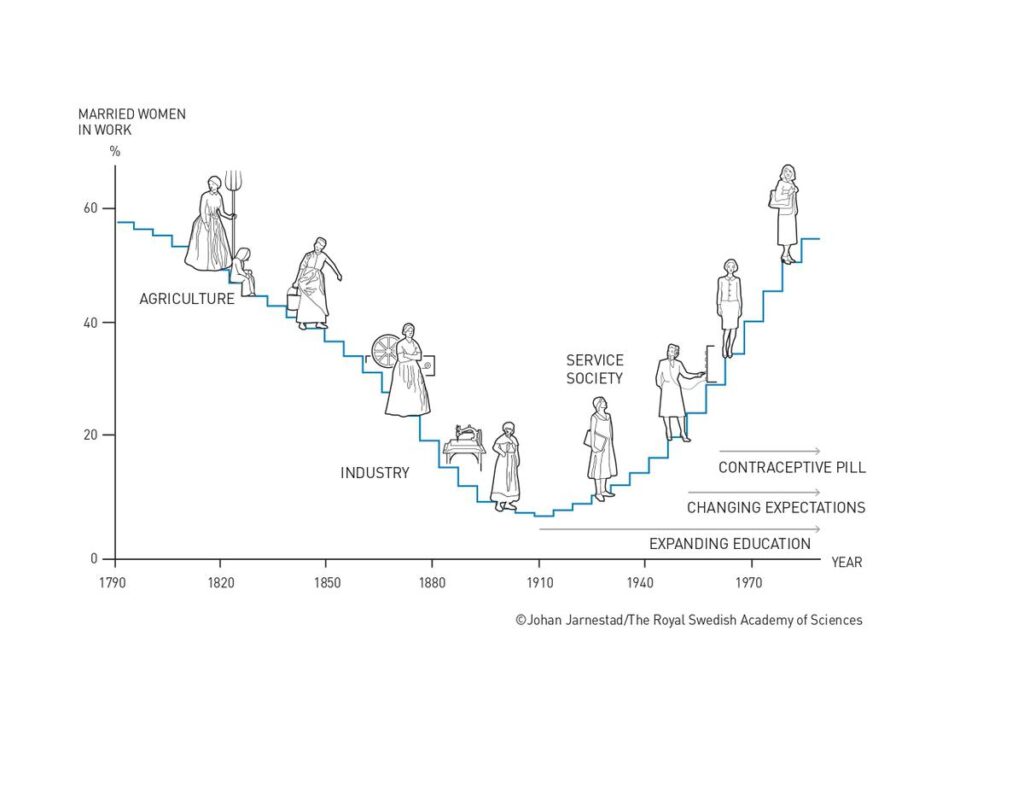 Tras reunir una base de datos de 200 años mucho más precisa, Claudia Goldin resumió que la participación de la mujer en el mercado laboral desde el inicio de la Revolución Industrial hasta finales del siglo XX se puede plasmar en un gráfico en forma de U (ver debajo). Dicho gráfico muestra como a finales del siglo XVIII cerca del 60% de las mujeres participaban (informalmente) en el mercado laboral, consistiendo este principalmente de empleos agrícolas, reduciéndose a un 10% a principios del siglo XX y volviendo a incrementarse a un 55% a finales de dicho siglo, tras el intenso proceso de terciarización de la economía en el periodo.