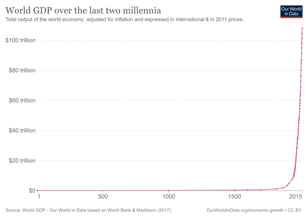Ya es mala suerte, para los detractores de la economía de mercado, que el crecimiento se diere en aquellos momentos en los que la Revolución industrial comenzó (mediados del s.XVIII), llegando a consolidarse un siglo después. De hecho, antes de 1800, el nivel de renta de las economías preindustriales (es decir, agrarias) aumentaba de forma muy tenue, y en caso de darse un crecimiento económico, no era ni acumulativo ni estable en el tiempo. Fue durante el s.XIX cuando el proceso de industrialización, las economías de escala y la producción en masa se fue difundiendo desde Gran Bretaña al resto de los países occidentales, para acabar desembocando en Norteamérica y Japón. Llegando así al punto donde, a mitad del s.XX, los tigres asiáticos, China, India o Brasil, se sumaron al crecimiento económico postindustrial hasta consolidarse, como los conocemos hoy, en economías emergentes.