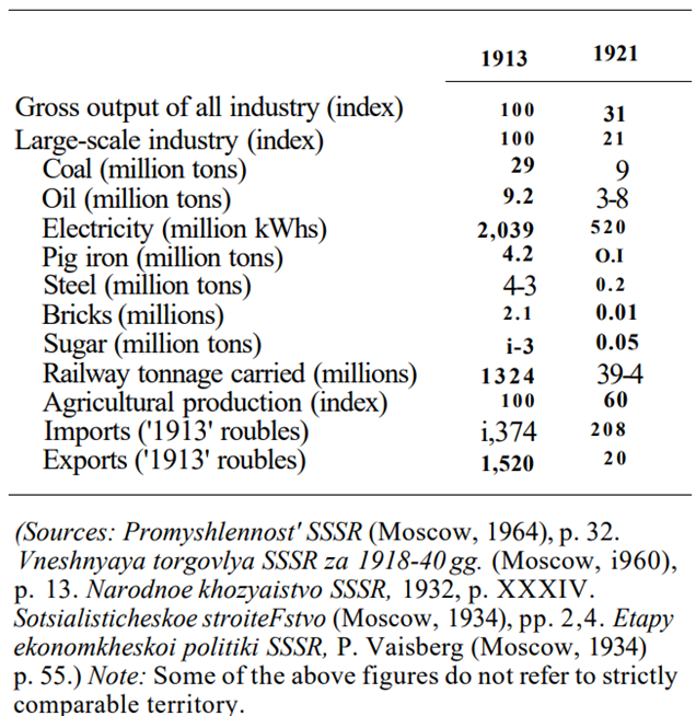 Lenin en el Programa del Partido Comunista de 1919 explicitó que lucharían para llevar a cabo una de las medidas más radicales de su esquema: la abolición del dinero. Las consecuencias de esta planificación fueron, en términos de productividad, enormes: véase la comparativa entre 1913-1921.