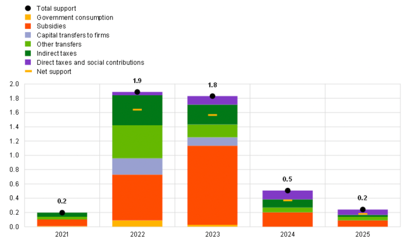 Los gobiernos europeos han tomado medidas de política fiscal discrecionales para combatir los altos precios. El objetivo es ayudar a los hogares mitigar la caída de sus ingresos en términos reales. El Banco Central Europeo estima que las ayudas han podido tener un peso de alrededor del 2% del PIB. Estas ayudas han llegado en forma de subsidios y transferencias y la reducción de impuestos indirectos. Se puede ver en este gráfico.