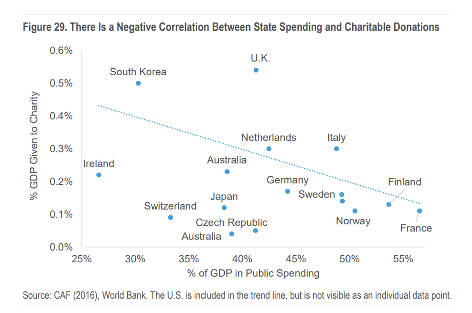 Por ello, el gasto público tiende a desplazar al gasto y la inversión privados. Los economistas llaman a este fenómeno desplazamiento. El auge del Estado del bienestar, por ejemplo, ha desplazado a la caridad privada. Un informe de Citigroup afirma: “En los países con un gasto público más elevado, existe la sensación de que cualquier deuda con la sociedad se ha saldado a través de la factura fiscal de un individuo o una empresa. Donde hay menos gasto público, hay una mayor sensación de que se debe algo”. Esta distinción marca la tendencia del gráfico que relaciona gasto público y donaciones.